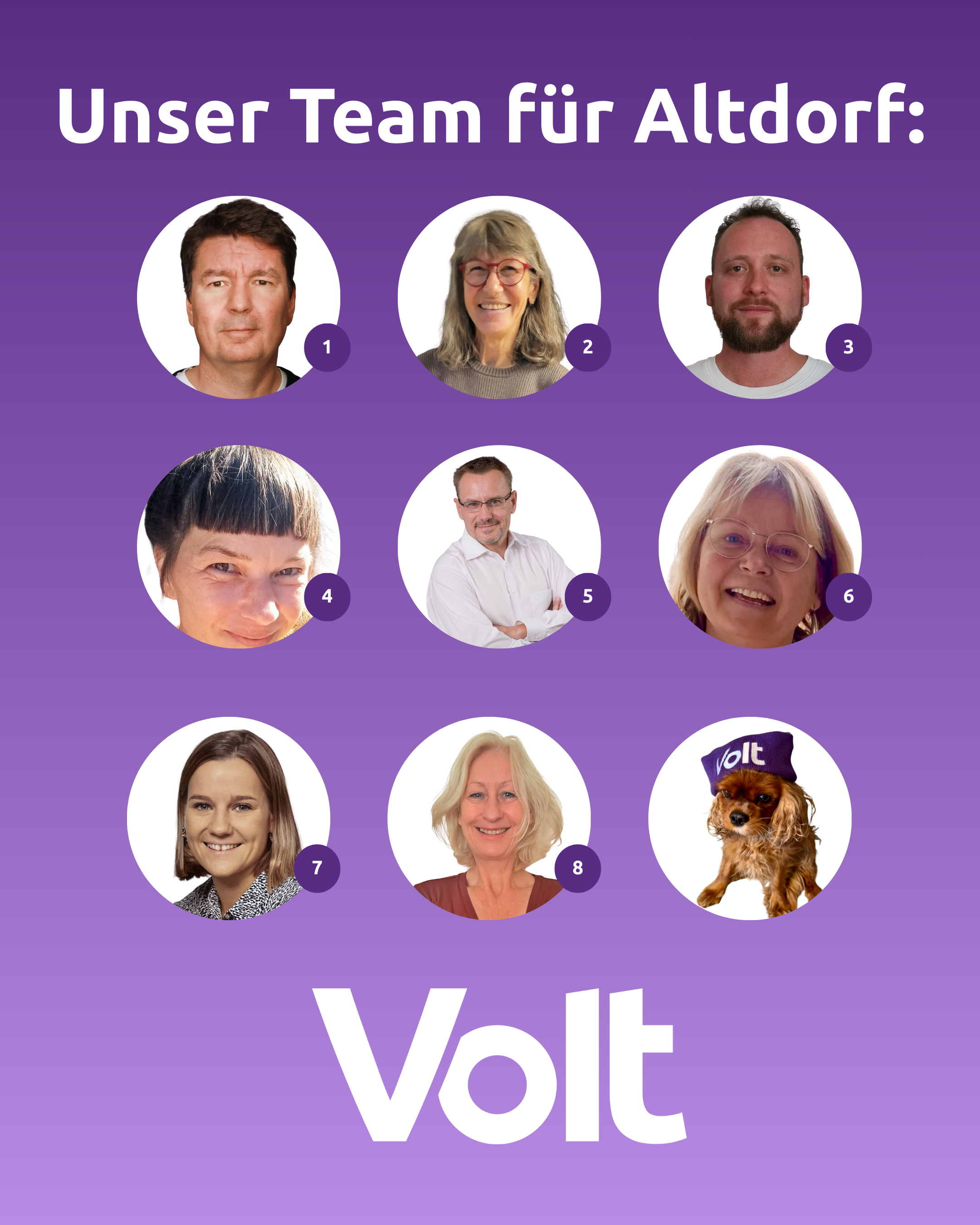Neben Christian Lamprecht, der seit 2020 Mitglied das Stadtrats ist, treten sieben weitere Menschen aus Altdorf erstmals zur Wahl an und möchten neue Ideen für Altdorf einbringen und unterstützen! Leider darf unsere zweite Wunsch-Spitzenkandidatin Kübra Cibir dieses Mal noch nicht an der Wahl teilnehmen, da ihr Antrag auf die deutsche Staatsbürgerschaft nicht rechtzeitig genehmigt wurde. Das ist sehr schade, aber sie unterstützt Volt Altdorf trotzdem mit ihrer sympathischen und aufgeschlossenen Art und bereichert unser Team mit ihrer Perspektive und ihren Ideen!