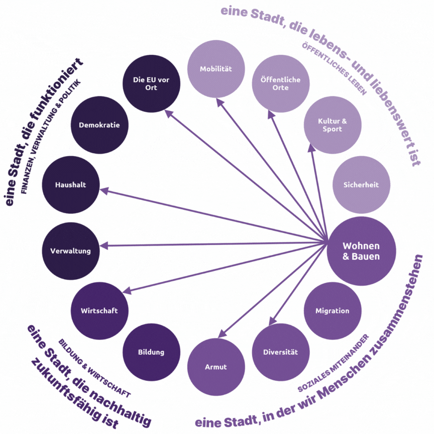 Wir stehen für klimagerechten und nachverdichteten Wohnraum, gemeinwohlorientierten Neubau, aktive Liegenschaftspolitik und effiziente Wärmenetze. Migration und Integration sollen niedrigschwellig, mehrsprachig und digital unterstützt erfolgen, mit Einbindung von Ehrenamt und migrantischen Organisationen. Diversität wird in Verwaltung, Bildung und öffentlichem Raum sichtbar gelebt, institutionelle Diskriminierung systematisch abgebaut. Armut wird durch konsumfreie Begegnungsorte, barrierefreie Sozialleistungen, altersgerechte Quartiersplanung und stabile Arbeitsmarktangebote bekämpft.