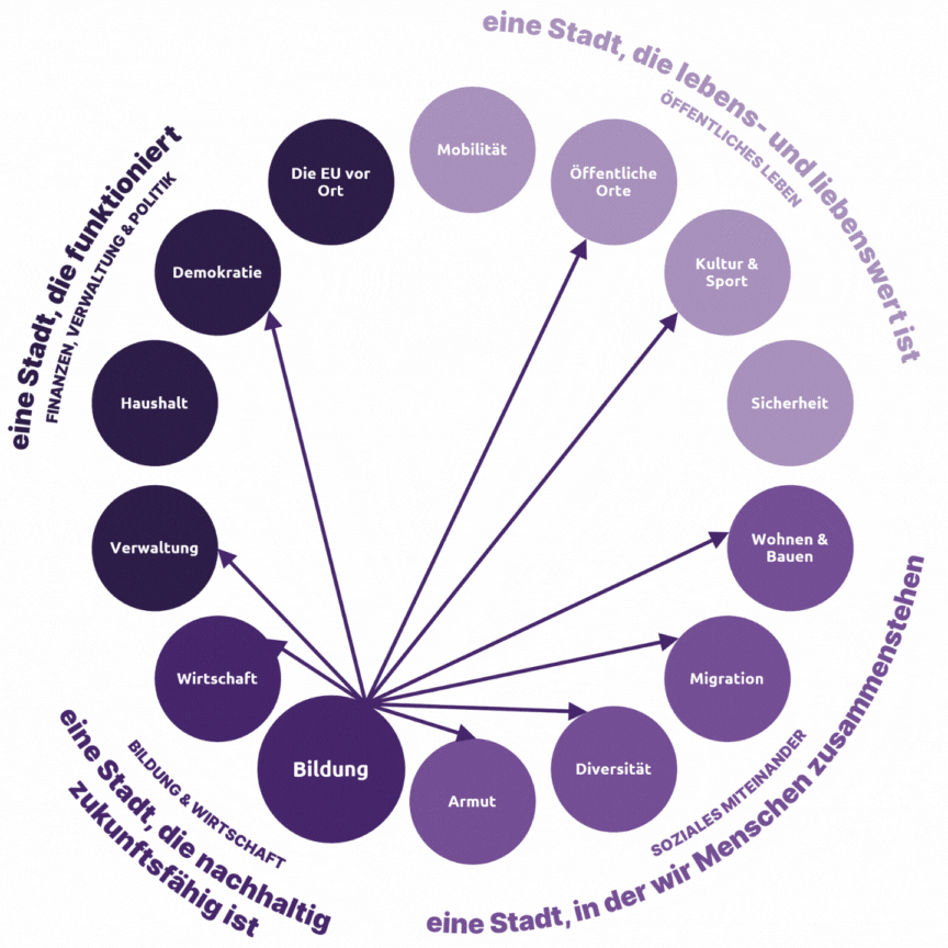 Volt Darmstadt setzt sich mit 11 Maßnahmenpaketen und insgesamt 57 Maßnahmen für zukunftsfähige Bildung, lebenslanges Lernen und eine starke Wirtschaft ein.