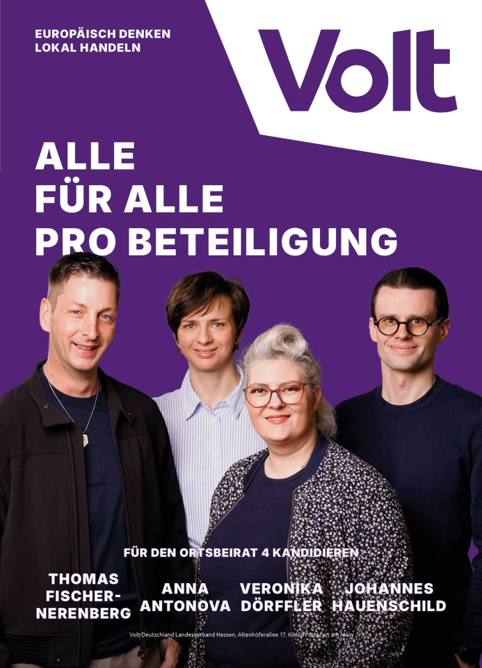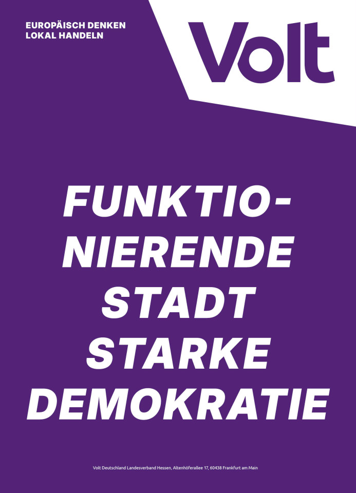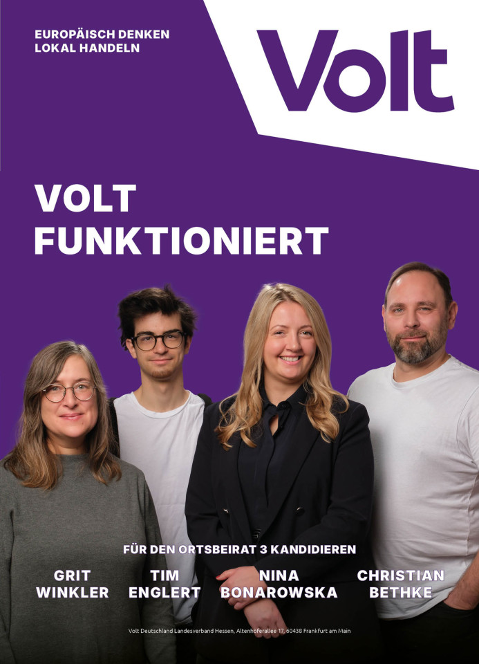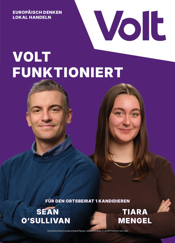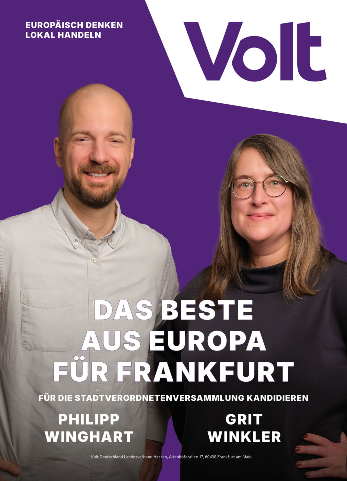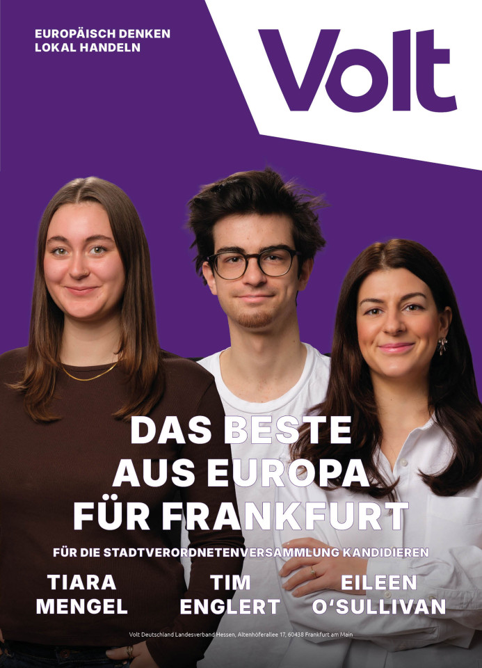 Volt Frankfurt macht junge Politik, trifft mutige Entscheidungen und schafft damit eine positive Perspektive für die Frankfurter Stadtgesellschaft und darüber hinaus. Denn wirklich erfolgreich wird Frankfurt nur in einem ebenso erfolgreichen RheinMain-Gebiet. Dieser Blick über den Tellerrand reicht bei uns europaweit!