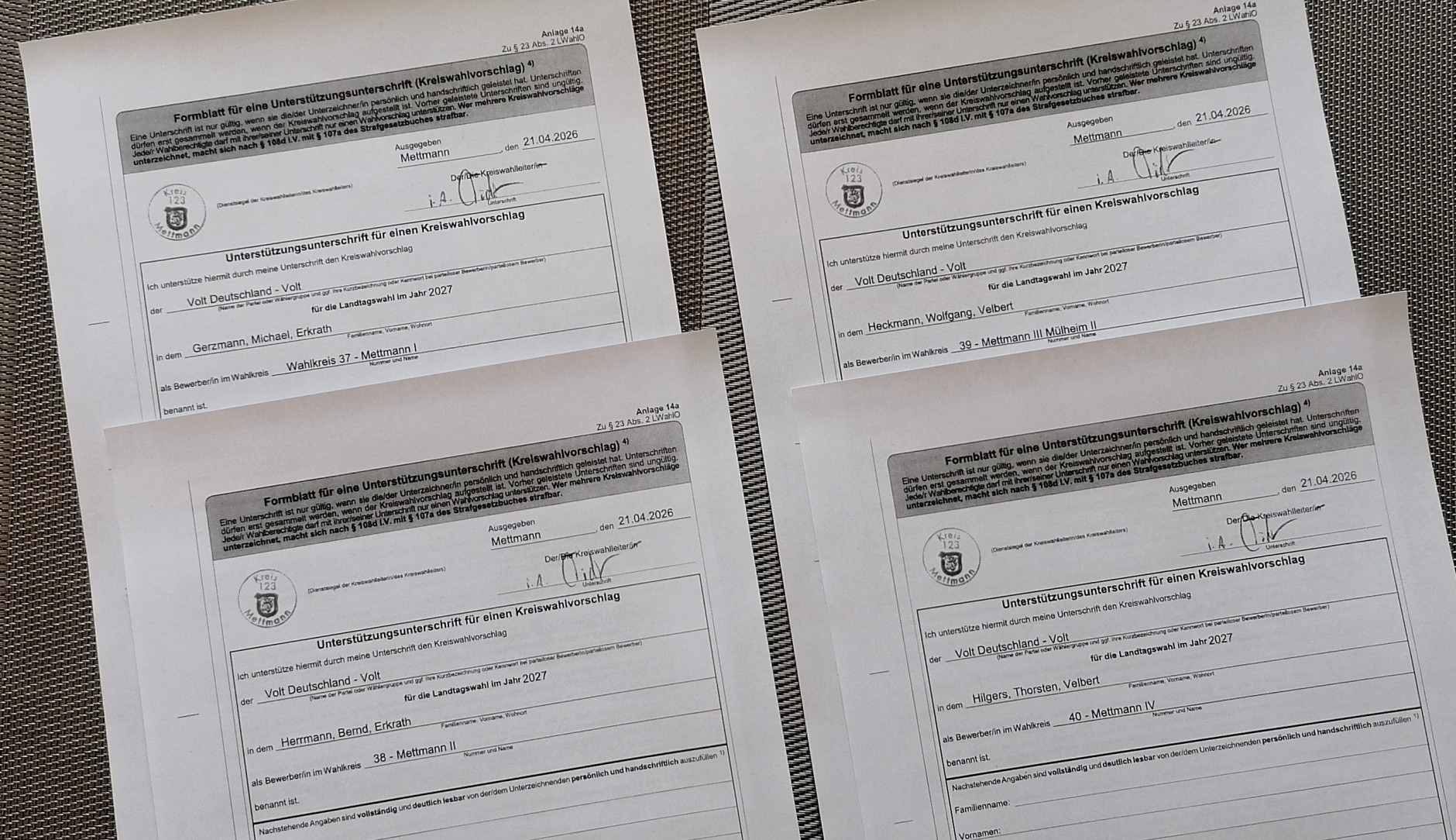 Nachdem wir unsere Kandidierenden für unsere vier Wahlkreise im Kreis Mettmann gewählt haben, brauchen wir nun für jeden Wahlkreis mindestens 200 Unterstützungsunterschriften von Menschen, die im jeweiligen Wahlkreis wohnen.