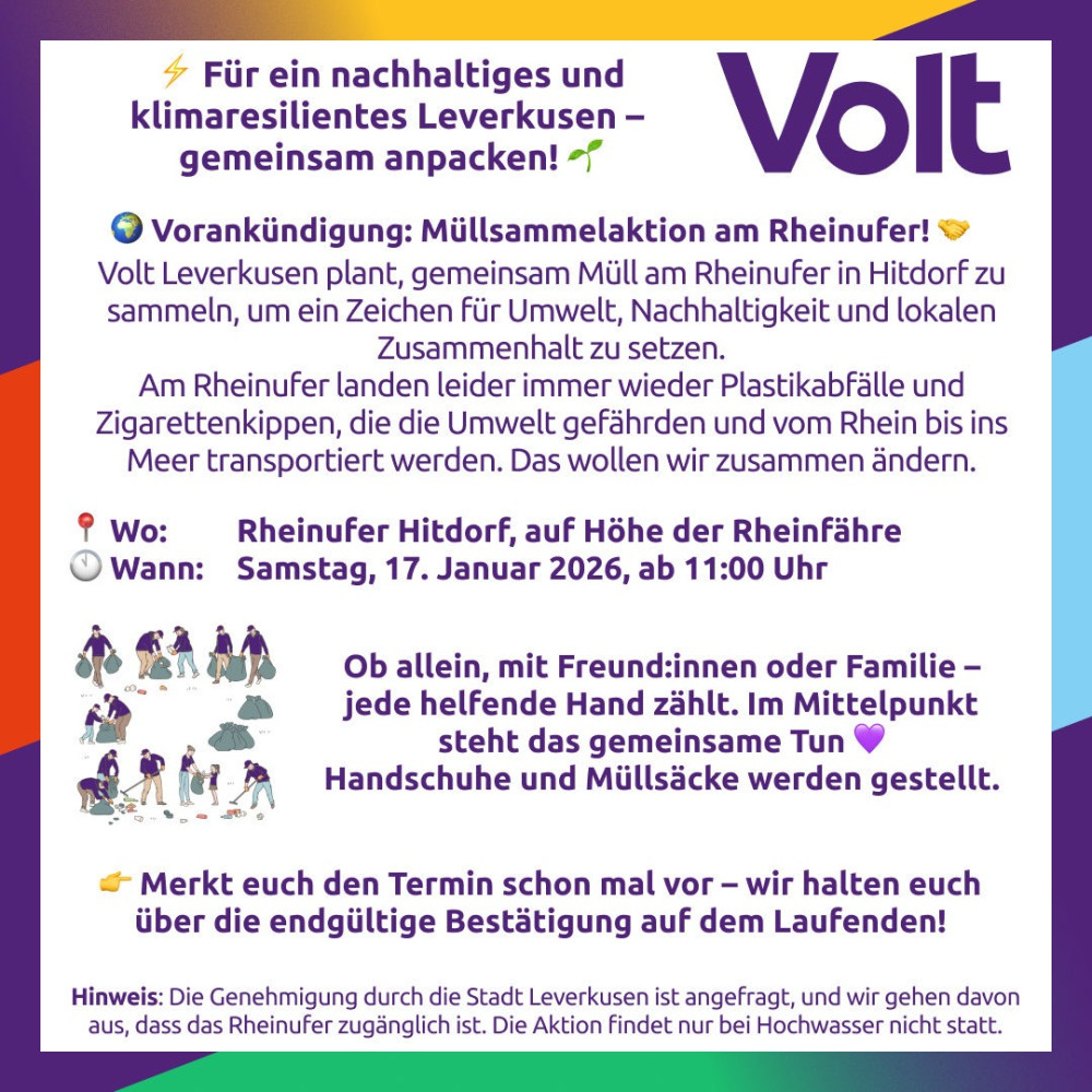 Das Volt Team Leverkusen plant, gemeinsam Müll am Rheinufer in Hitdorf zu sammeln, um ein Zeichen für Umwelt, Nachhaltigkeit und lokalen Zusammenhalt zu setzen.