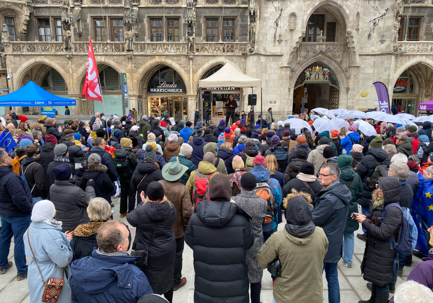 Am Samstag war es voll zwischen den bunten Infoständen auf dem Münchner Marienplatz. In klirrender Kälte standen die Omas gegen Rechts neben der CSU, Ukraine-Freunde neben Münchner Frauenverbänden, alle zusammen gegen Extremismus und für eine lebendige Demokratie.