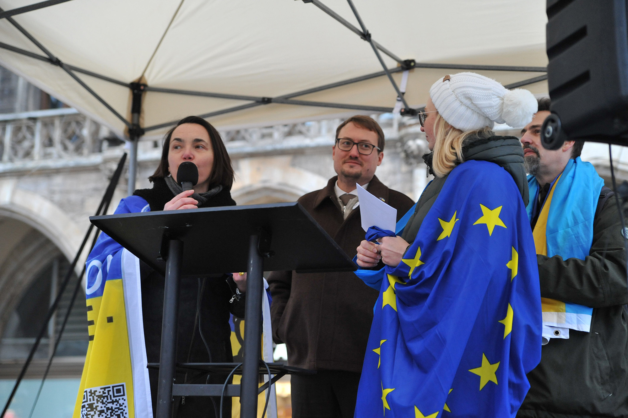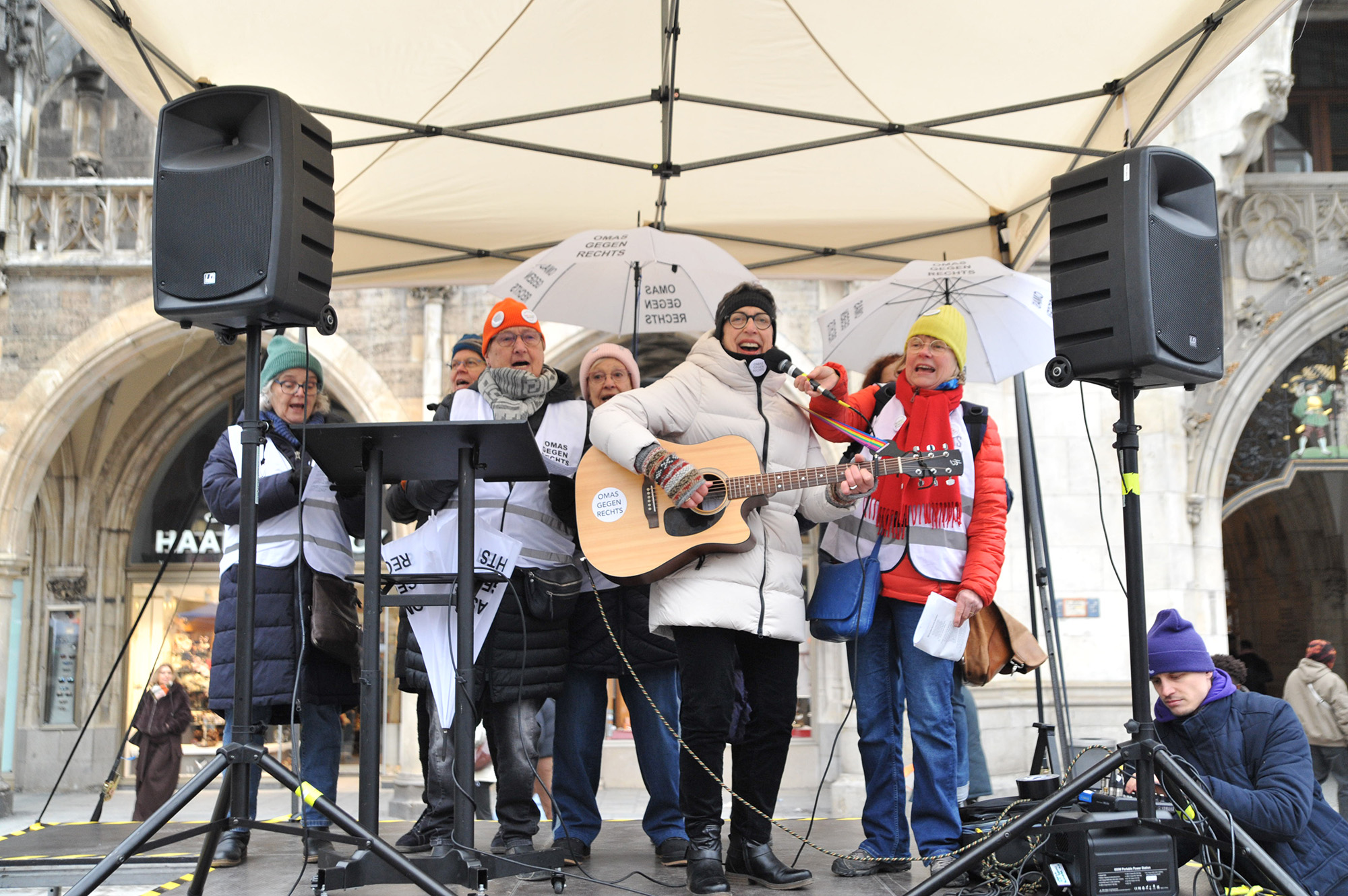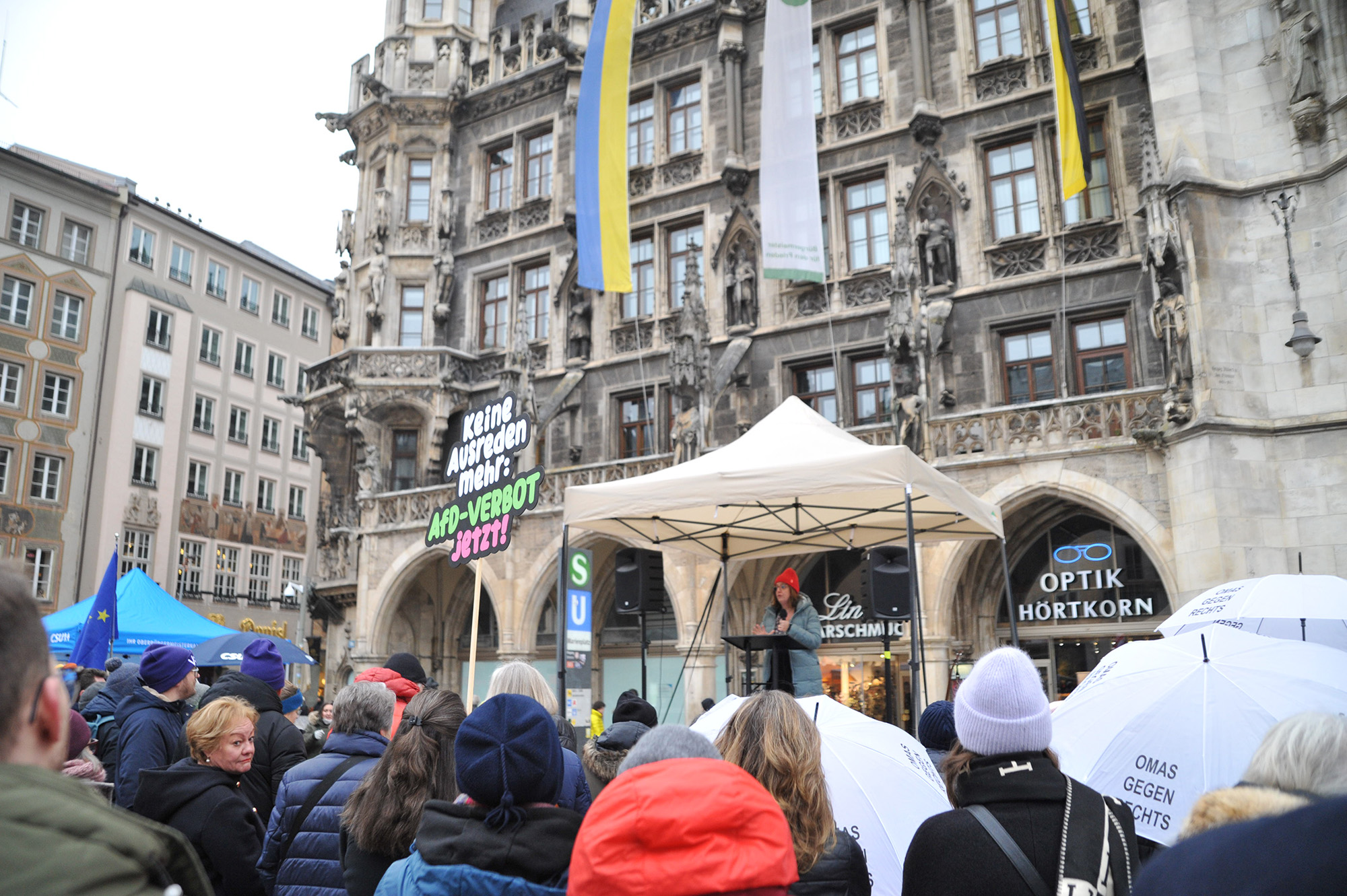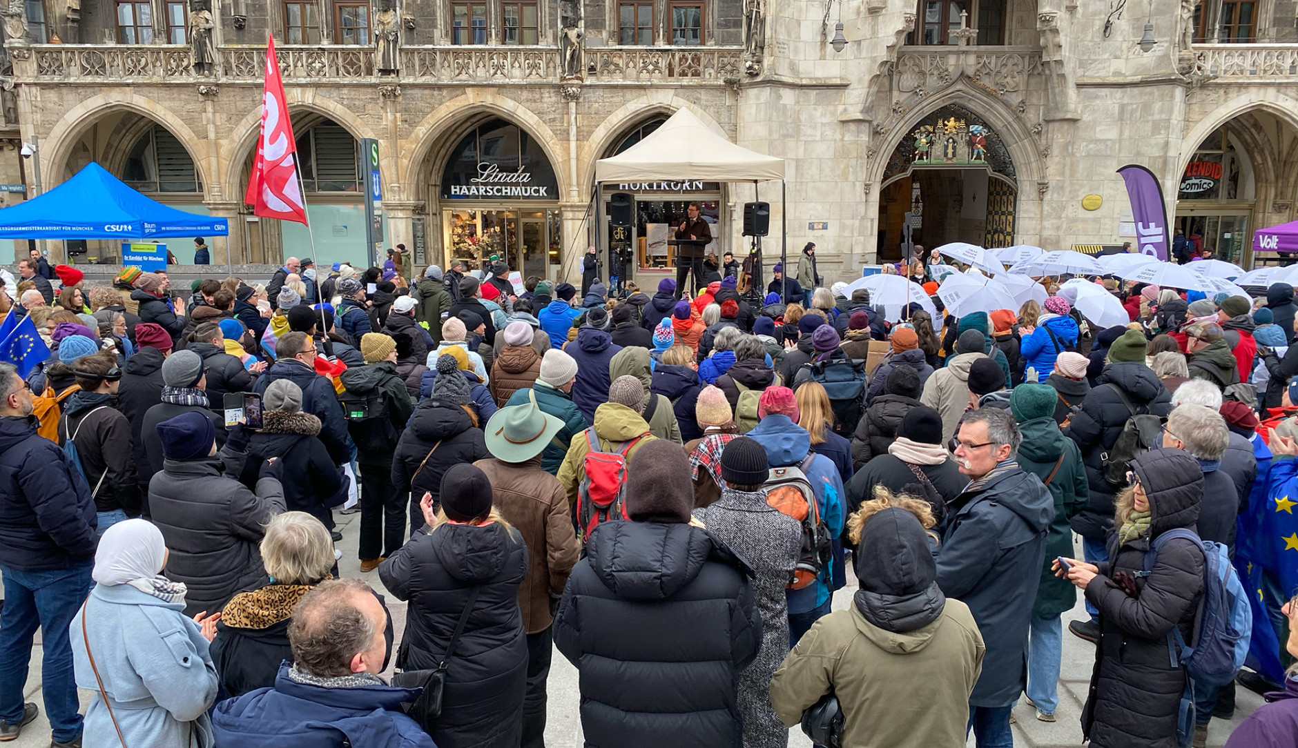 Am Samstag war es voll zwischen den bunten Infoständen auf dem Münchner Marienplatz. In klirrender Kälte standen die Omas gegen Rechts neben der CSU, Ukraine-Freunde neben Münchner Frauenverbänden, alle zusammen gegen Extremismus und für eine lebendige Demokratie.