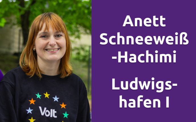 Im Wahlkreis 37 Ludwigshafen I kandidiert Annett Schneeweiß-Hachimi, 38. Durch ihr berufliches und gesellschaftliches Engagement fand sie im Juli 2024 zu Volt. Ihr Fokus liegt auf sozialer Teilhabe, Chancengerechtigkeit und einer vielfältigen Gesellschaft. „Ich möchte dazu beitragen, dass Politik wieder näher an den Menschen ist und konkrete Verbesserungen im Alltag schafft“, erklärt Schneeweiß-Hachimi.