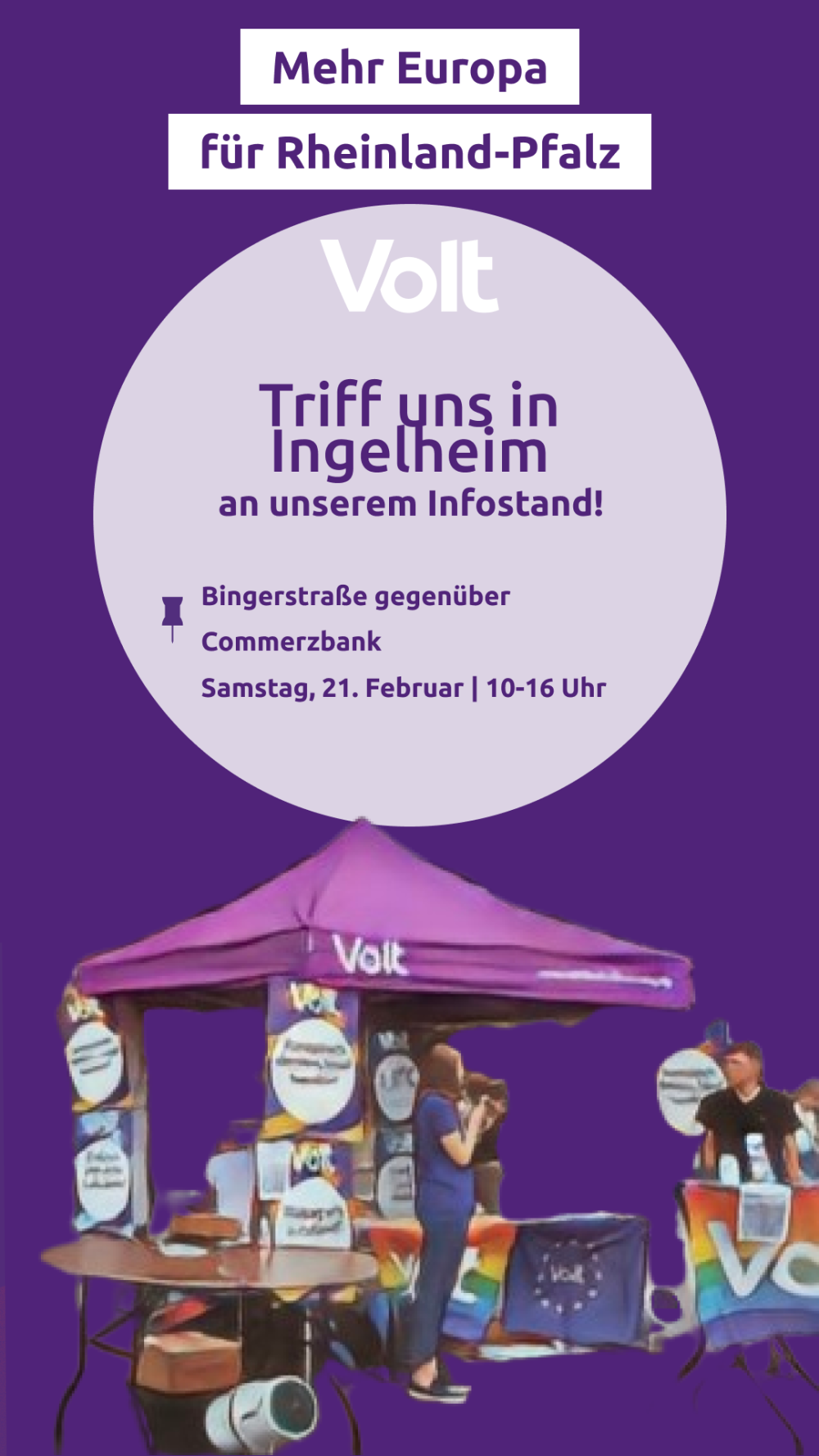 Du interessierst dich für Volt und willst uns näher kennenlernen? Dann komm zu unserem Infostand in Ingelheim! Wir informieren über unser Wahlprogramm und beantworten Fragen zur kommenden Landtagswahl. Wir freuen uns schon auf dich!