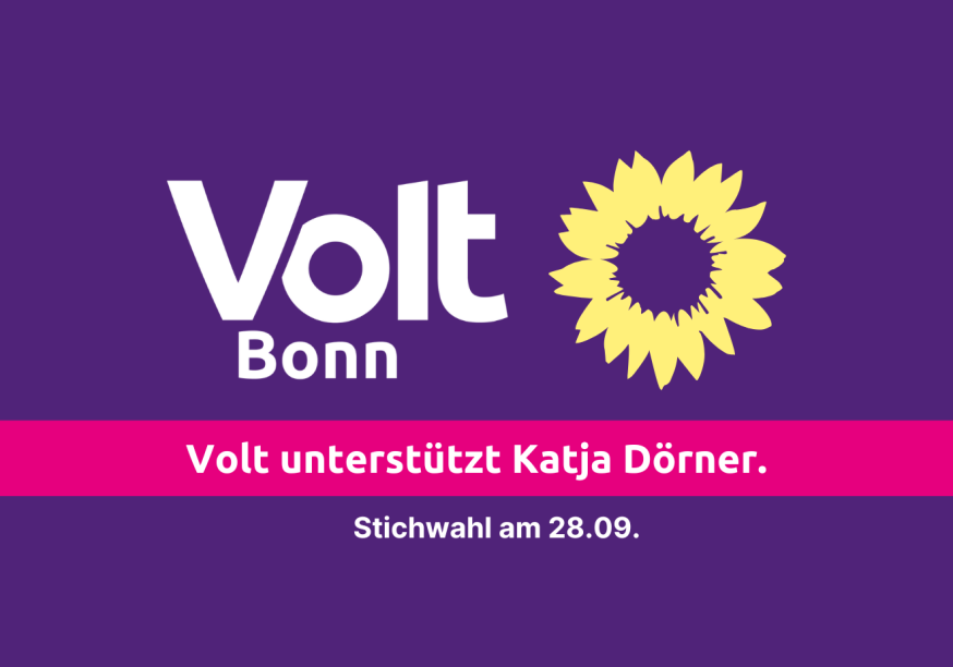 Volt Bonn hat im Vorfeld der Stichwahl für das Oberbürgermeister*inamt ihre Mitglieder befragt. Mit großer Mehrheit haben sie sich dafür ausgesprochen, die Kandidatin von Bündnis 90/Die Grünen, Katja Dörner, zu unterstützen.